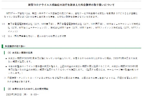 NTT東西やドコモなどNTTグループ各社は、支払期限が2020年2月末日以降になっている料金について、利用者から申し出があった場合に2020年5月末まで期限を延長するとしています。