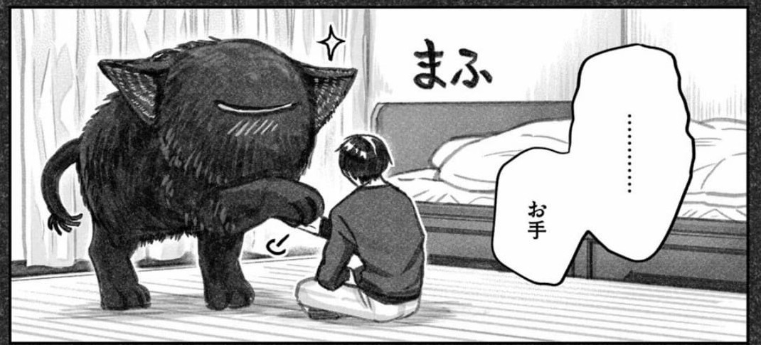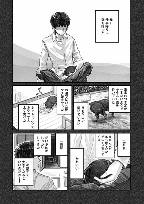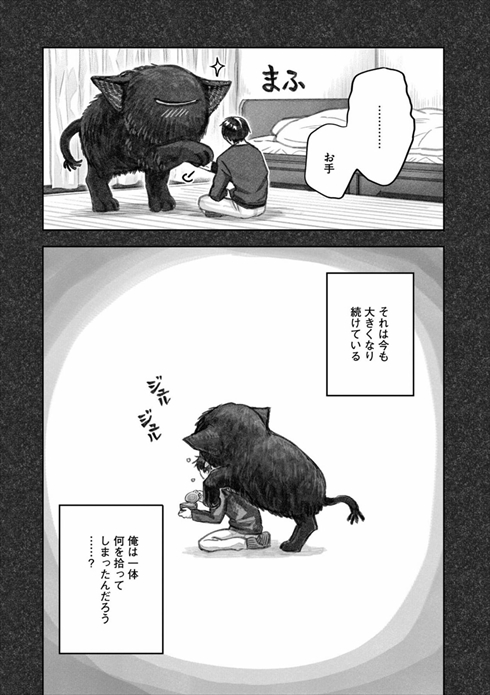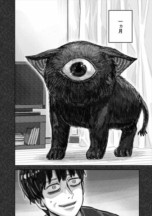ふらふら道を歩いていた小さな黒い猫を拾ったサラリーマンのイガイさん。しかし“猫”は見る間に大きくなり、1カ月でイガイさんよりも大きくなってしまいます。しかも一つ目で口からは触手のようなものが……「一体なにを拾ってしまったんだろう……?」と戸惑いながらも“猫”と生活するイガイさん。