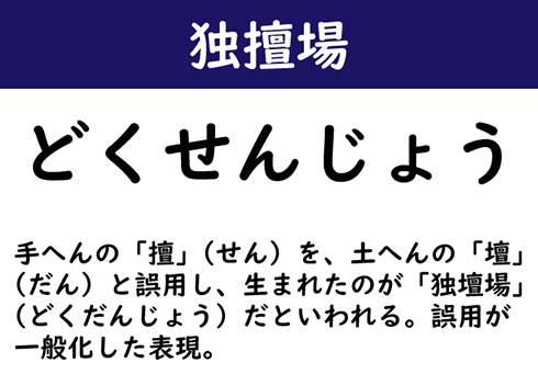 手へんの「擅」(せん)を、土へんの「壇」(だん)と誤用し、生まれたのが「独壇場」(どくだんじょう)だといわれる。誤用が一般化した表現。