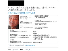 拡散されているのは「この手紙をもって、俺のコメディアンとしての最後の仕事とする」から始まる文章画像。「これからのコントの復活は、緻密な企画立案、それとライブの復活にかかっている」「俺は、志村がその一翼を担える数少ない芸人であると信じている」と感動的な言葉が並び、ツイートには「いかりや長介さんが生前最後に送った志村けんさんへの手紙を思い出して泣いてる…」との言葉が添えられいます。