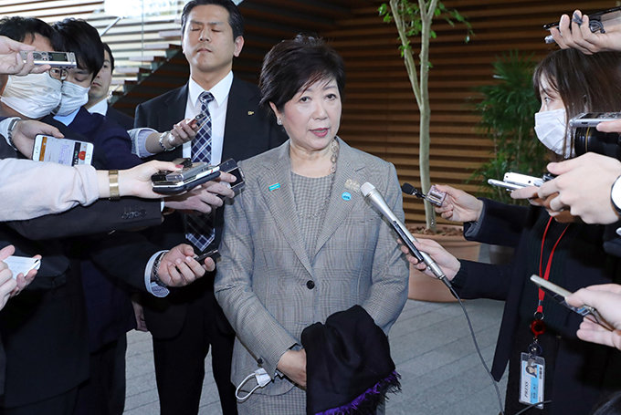 安倍晋三首相との面会を終え記者団の質問に答える小池百合子東京都知事=2020年3月31日午後、首相官邸 写真提供:産経新聞社