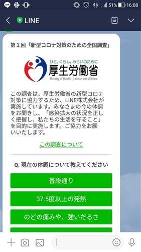 同調査は、LINEアプリ上で体調などについて簡単な質問に応えるだけで参加可能。第1回は3月31日から4月1日にかけて行われ、続く第2回が4月5日から6日にかけて予定されています。