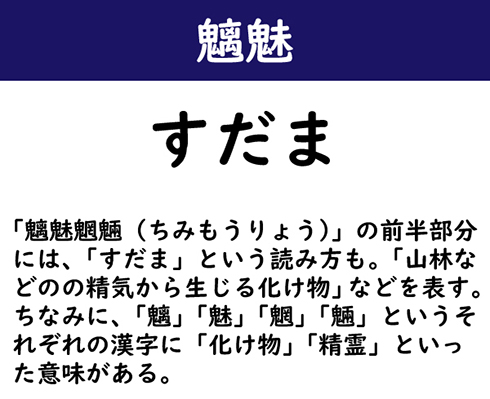 「魑魅魍魎(ちみもうりょう)」の前半部分には、「すだま」という読み方も。「山林などの精気から生じる化け物」などを表す。ちなみに、「魑」「魅」「魍」「魎」というそれぞれの漢字に「化け物」「精霊」といった意味がある。