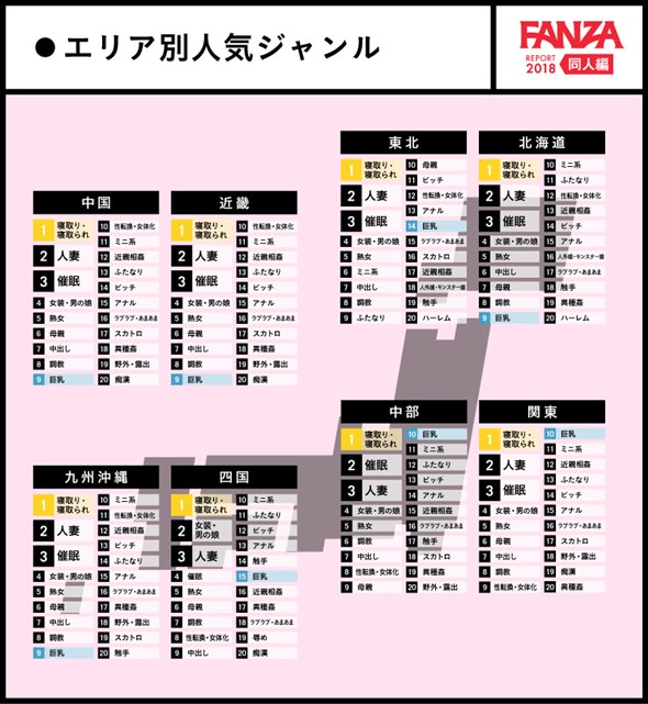 漫画系のエロコンテンツのビッグデータとしては、FANZAが2018年末に公開した「FANZA REPORT 2018 同人編」が記憶に新しいところ。FANZAの調査では「寝取り・寝取られ」が圧倒的強さを見せましたが、Komifloでは「寝取られ」がトップなのは2県(千葉、島根)にとどまっています。