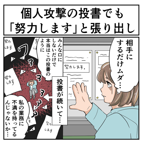ほとんどの人は、掲示された件の投書を見て「くだらないことをするね」「こんなの気にしないで」という感じで、こちらに同情的でしたし、私も最初は「相手にするだけムダ」という感覚でした。