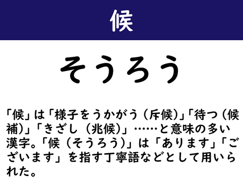 「候」は「様子をうかがう(斥候)」「待つ(候補)」「きざし(兆候)」……と意味の多い漢字。「候(そうろう)」は「あります」「ございます」を指す丁寧語などとして用いられた。