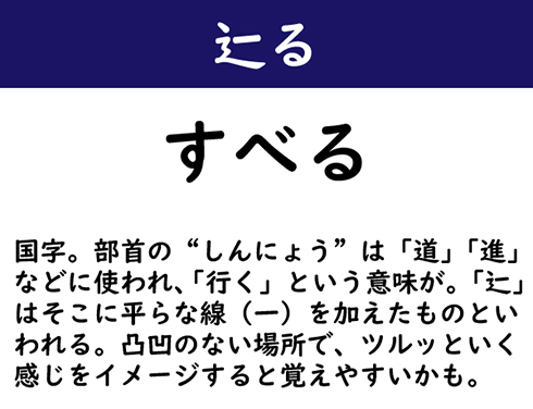国字。部首の“しんにょう”は「道」「進」などに使われ、「行く」という意味が。「辷」はそこに平らな線(一)を加えたものといわれる。凸凹のない場所で、ツルッといく感じをイメージすると覚えやすいかも。
