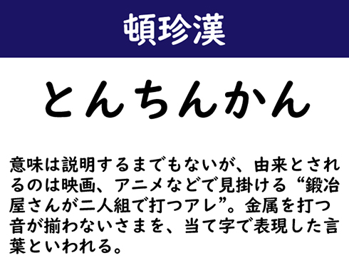 意味は説明するまでもないが、由来とされるのは映画、アニメなどで見掛ける“鍛冶屋さんが二人組で打つアレ”。金属を打つ音が揃わないさまを、当て字で表現した言葉といわれる。