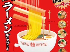「動く!ラーメンディスプレイ」は「しょうゆ」「もやし味噌」「しお」「とんこつ」「担々麺」の5種類。麺はゴム製で、箸が上下に動くと「本物さながらにしなやかに動く」とのこと。天面にはラーメンの写真が貼られています。
