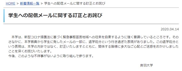 緊急事態宣言地域への往来自粛を求める中で、福島県にある奥羽大学の教授が「福島県外に出れば退学処分になる」という通達メールを学生に送信した件について、大学側は4月14日、「行き過ぎた表現がありました」として撤回・謝罪しました。