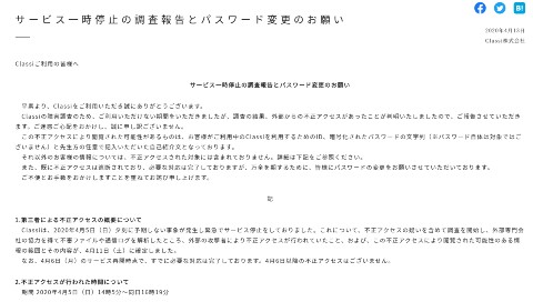 攻撃者に閲覧された可能性があるのは、Classiを利用するためのID(約122万人分)、パスワードが暗号化された文字列(約122万人分)、任意記入の教員の公開用自己紹介文(2031件)。
