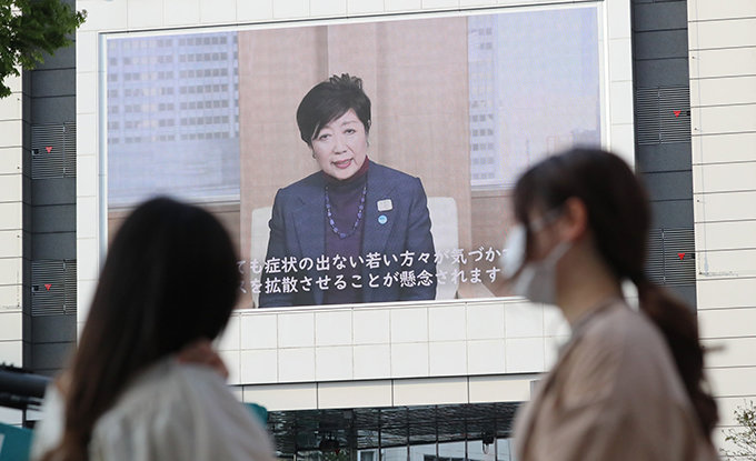 大型スクリーンで、新型コロナウイルスの感染拡大を阻止するため協力を呼びかける小池都知事=2020年4月7日午後、東京都新宿区 写真提供:産経新聞社
