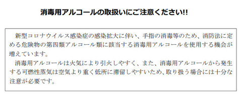 なお危険物に該当する消毒用アルコールを80リットル以上貯蔵する場合には、消防署への届け出が必要となります。