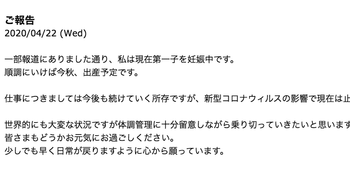北川さんはブログで、「一部報道にありました通り、私は現在第一子を妊娠中です」とあらためて報告。出産は秋ごろを予定しており、現在は新型コロナウイルスの影響で仕事はストップしているとのことですが、今後も仕事は続けていくとのことで、「世界的にも大変な状況ですが体調管理に十分留意しながら乗り切っていきたいと思います。皆さまもどうかお元気にお過ごしください。少しでも早く日常が戻りますように心から願っています」と締めくくっています。