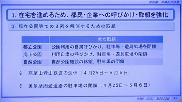 都立公園等では「3密」解消のため、園内の駐車場や遊具閉鎖の取り組みも行います。