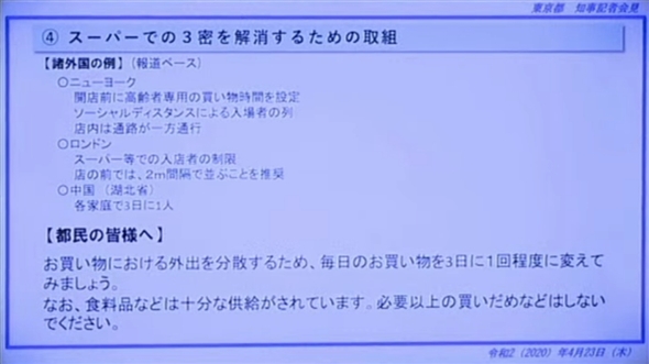 東京都は4月23日、スーパーでの密集を解消するための取り組みとして、買い物のための外出は3日に1回程度に控えるよう都民に向けて呼びかけました。買い物の頻度を減らす場合も、食料品などは十分な供給がされているため、必要以上の買いだめは不要とも。