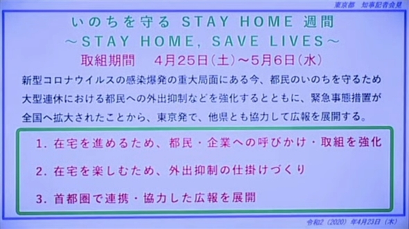 小池都知事は会見で、自粛が続く今もなお、連日100人以上の新型コロナウイルス感染者が確認されている状況に触れ、ゴールデンウィークに向けた対策強化が不可欠であることを強調。4月25日〜5月6日にかけてを「いのちを守る STAY HOME 週間」と位置付け、外出自粛を一層呼びかけていく方針を明らかにしました。