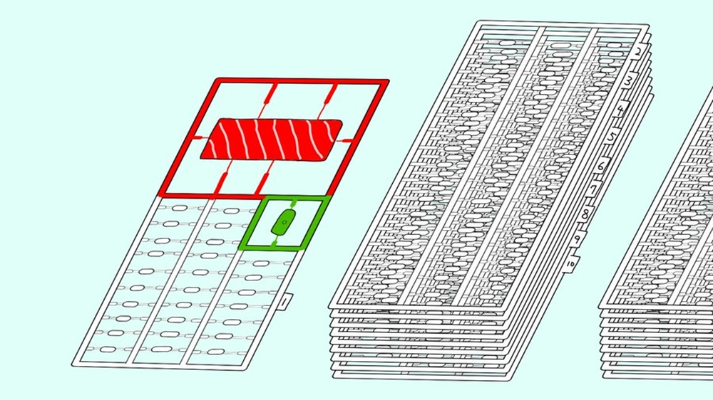 シュールなイラストを投稿する、ンバヂ(@nbaji9)さんの新作「寿司のプラモデル」は、「マグロのお寿司」を組み立て前のプラモデルで表現したイラスト。赤のマグロ、緑のワサビ、そして白の米(シャリ)が1つのランナーとなっているのですが、特筆すべきはシャリのパーツで、1粒1粒が別のパーツとして分けられているのです。
