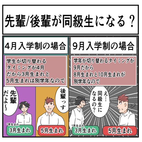 1:“学年が切り替わる時期”が変わって、先輩/後輩が同級生になる?