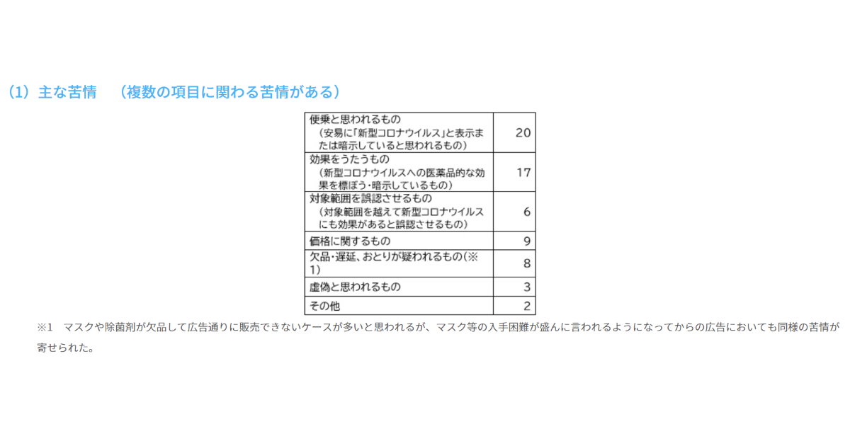 このレポートは、2020年1月〜3月に寄せられた苦情からキーワード「コロナ」「ウイルス」「新型」「肺炎」で抽出し、その中から無関係なものを除いた118件を整理したもの。「新型コロナウイルスへの効果を標ぼうするもの、新型コロナウイルス等と表示(暗示含む)するもの、マスクの高額販売、欠品しているのに広告に掲載」など表示関するものが50件、「新型コロナウイルスの感染拡大や外出自粛の状況に関連付け、広告表現が不適切」などとする苦情が68件でした。