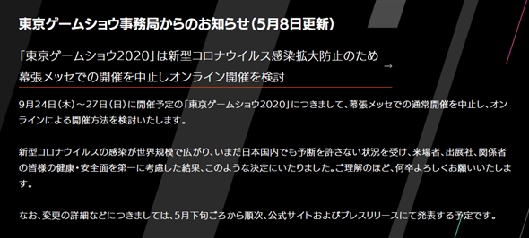 コンピュータエンターテインメント協会(CESA)は5月8日、9月24日〜9月27日に予定されていた「東京ゲームショウ2020」の幕張メッセでの開催中止を発表。その代わりとしてオンラインでの開催を検討していることを明かしました。