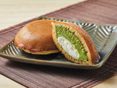 どらもっち(お抹茶&ホイップ)は、どら焼き生地の中にホイップクリームを入れた和洋折衷どら焼きシリーズ「どらもっち」の抹茶バージョン。宇治抹茶を使用した抹茶クリームが入っています。価格は180円(税込、以下同)。