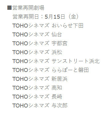 TOHOシネマズは、一部自治体で映画館に対する休業要請が解除されたことを受け、5月15日より全国10館の営業を再開すると発表しました。