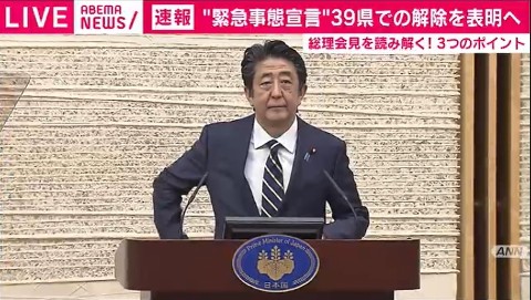 安倍首相は、緊急事態宣言を39県で解除すると発表しました。東京、神奈川、埼玉、千葉、北海道、大阪、京都、兵庫は引き続き緊急事態宣言の対象となります。