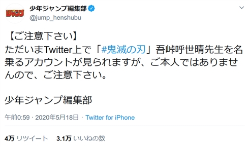 ジャンプ編集部はツイートで、「吾峠呼世晴先生を名乗るアカウントが見られますが、ご本人ではありませんので、ご注意下さい」と投稿。この書き込みと前後して偽アカウントも消滅しました。
