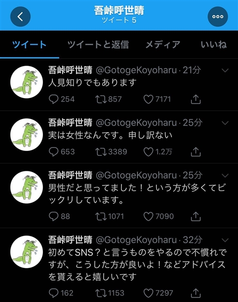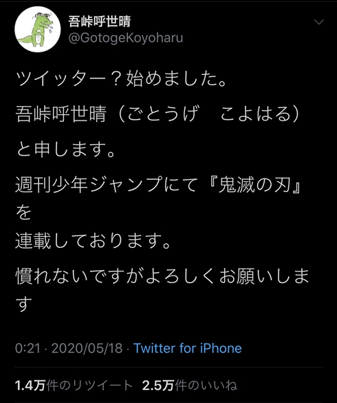 問題の偽アカウントは「ツイッター?始めました。吾峠呼世晴(ごとうげ こよはる)と申します。週刊少年ジャンプにて『鬼滅の刃』を連載しております」などと投稿。リツート数は1万件を超えるものもあり、フォロワー数も編集部が確認した時点で4万人を超えていました。当該アカウントは記事執筆時点で削除されています。