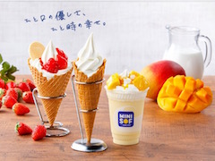 左から、ワッフルソフトクリーム いちご(490円/税別、以下同)、ソフトクリーム 北海道バニラ(360円)、飲むソフトクリームパフェ マンゴー(540円)公式サイトより