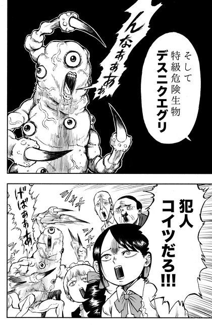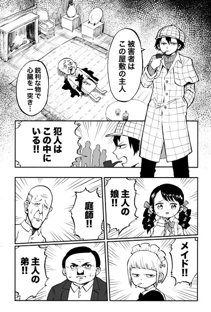 被害者は屋敷の主人。容疑者として浮かび上がったのは、家族、使用人、そして特級危険生物「デスニクエグリ」――。どこから突っ込んでいいのか分からない不条理探偵漫画が笑いを誘います。ゼッタイ犯人コイツだろ!
