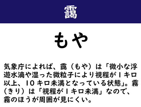 気象庁によれば、靄(もや)は「微小な浮遊水滴や湿った微粒子により視程が1キロ以上、10キロ未満となっている状態」。霧(きり)は「視程が1キロ未満」なので、霧のほうが周囲が見にくい。