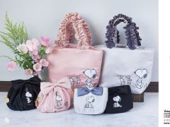 トートバッグ(各4719円、税込/以下同)は、持ち手にフリルがたっぷりついたキュートなサテン地のバッグです。グレー、ブラック、ピンクの3色が展開されています。表に刺しゅうされたスヌーピーとうさぎたちがたまらなくかわいい! 裏地もスヌーピーとうさぎのオリジナルプリント柄なので、カバンを開けるたびにテンションが上がりそうです。