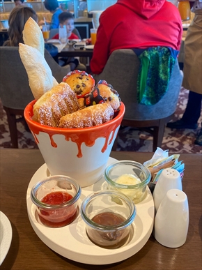このホテルは、ウォルト・ディズニーが家族でイタリアを旅行したときのころをイメージした最新のリゾートホテル。トッポリーノ・テラスの朝食は、ここでしか見られないコスチュームを着たアーティストなミッキーたちがやってきてくれます。ウォルト・ディズニー・ワールド全体が見渡せるような眺望の場所でキャラクターダイニングを体験できるのはなかなかありません。ご飯もなかなかのボリュームで、ここからゆったりとした1日をスタートできますね。