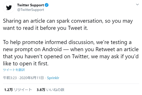 米Twitterは6月11日(日本時間)、記事を開かずにリツイートしようとするユーザーに対し、先に内容を確認してからリツイートするよう促すテスト機能をAndroidアプリ向けに開始したと発表しました。
