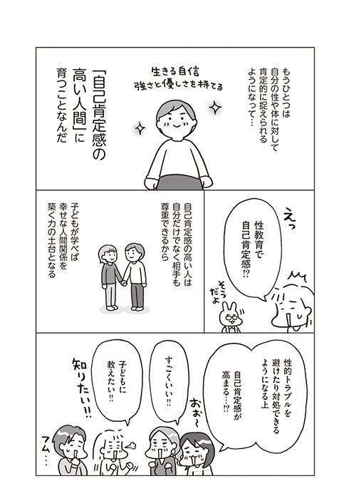 性教育が持っている「思春期に、“性交や妊娠出産”などについて“あの気まずい雰囲気”の中で教えるもの」というイメージに反して、本書は「幼児期から、性交や妊娠出産に限らず“自他を大切にするための考え方”について“家庭での日々の会話”で教えよう」と提案。これから性教育を受ける子どもだけでなく、これまでにあまり性教育を受けてこなかった大人にもヒントを与える作品となっています。