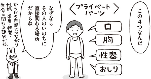 フクチマミさん(以下フクチ):体は全部分がその人のものですが、中でも特に「プライベートパーツ」と呼ばれるのは「口・胸・性器・お尻」の4カ所。この言葉には「そこは他人が勝手に触ったり/他人に触らせたり、見たり/見せたりしてはいけない大事な部位なんだよ」という意味合いがあります。「プライベートゾーン」「水着ゾーン」と呼ばれることもありますが、意味は変わりません。