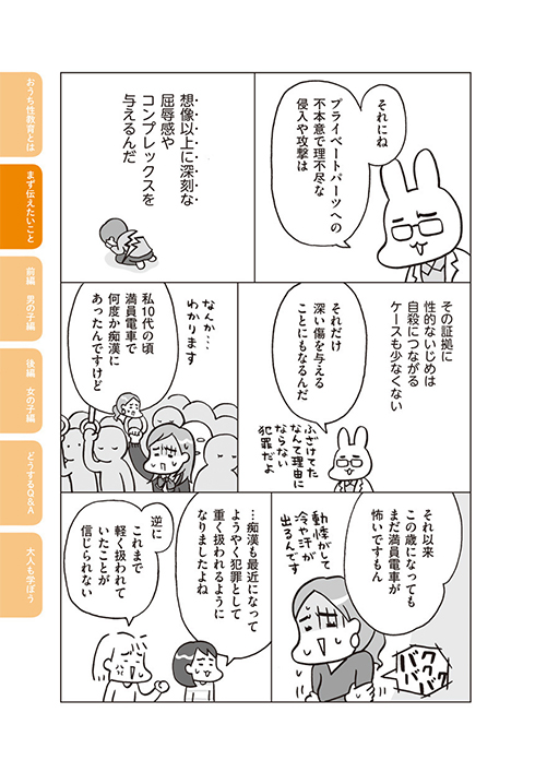 性教育が持っている「思春期に、“性交や妊娠出産”などについて“あの気まずい雰囲気”の中で教えるもの」というイメージに反して、本書は「幼児期から、性交や妊娠出産に限らず“自他を大切にするための考え方”について“家庭での日々の会話”で教えよう」と提案。これから性教育を受ける子どもだけでなく、これまでにあまり性教育を受けてこなかった大人にもヒントを与える作品となっています。