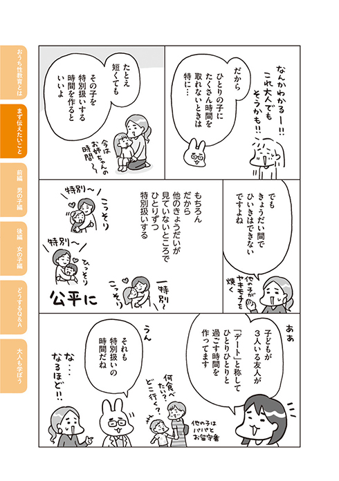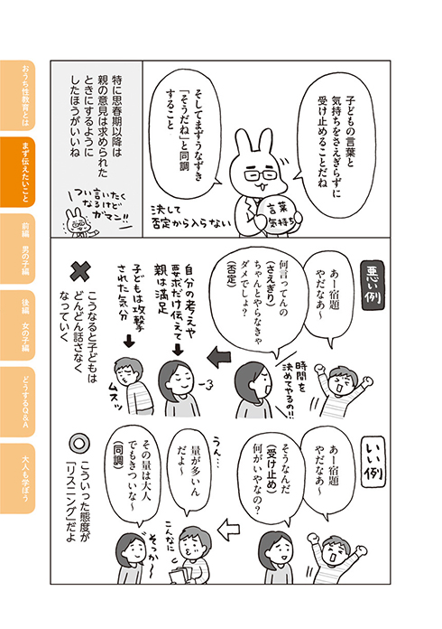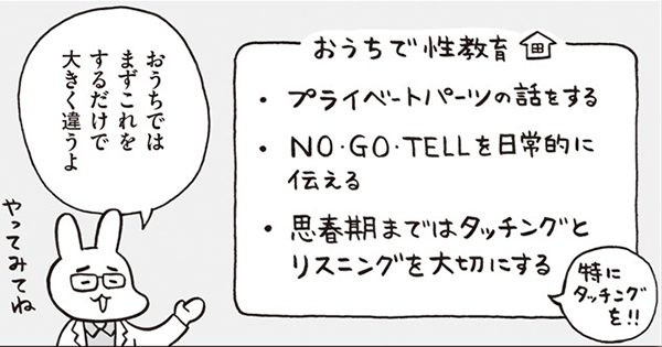 性教育が持っている「思春期に、“性交や妊娠出産”などについて“あの気まずい雰囲気”の中で教えるもの」というイメージに反して、本書は「幼児期から、性交や妊娠出産に限らず“自他を大切にするための考え方”について“家庭での日々の会話”で教えよう」と提案。これから性教育を受ける子どもだけでなく、これまでにあまり性教育を受けてこなかった大人にもヒントを与える作品となっています。