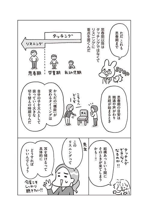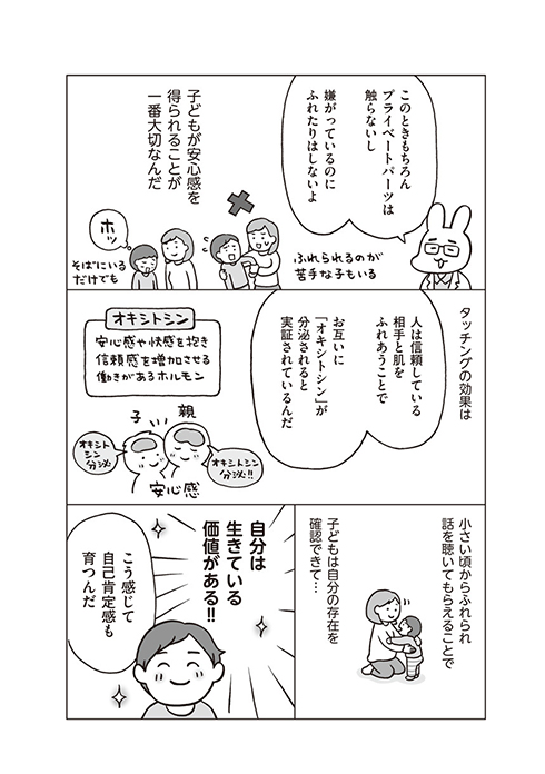 フクチマミさん(以下フクチ):本書のように「プライベートパーツ(口・胸・性器・お尻)は他人に勝手に触らせたり、触ったりしていけないよ」「大事な場所だから自分で洗おうね」といった風に教えるところから始めて、日常の中で体のこと、自分や他人を大切にすることなどを伝えるようにしていって。家の中から“あのソワソワ照れくさい感じ”が消えて、性の話がタブーではなくなりました。おかげで、性に関する質問をされたときもポジティブに答えられる雰囲気に変わった印象です。