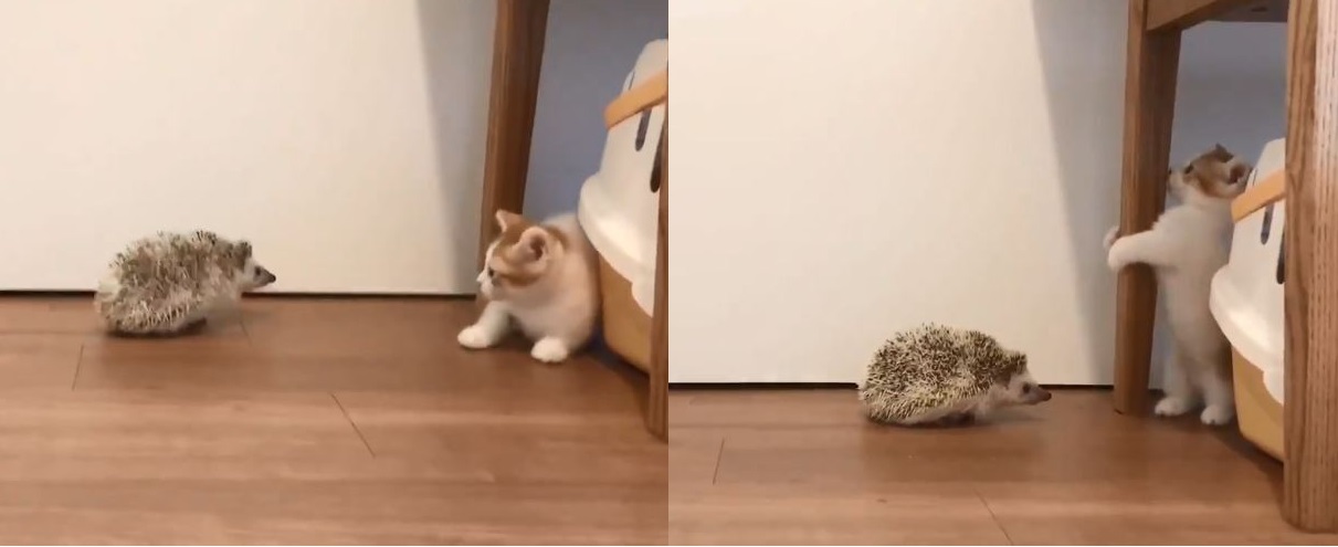 「だ、誰だニャ(柱にギュッ)」 子猫がハリネズミと初めて会ったときのリアクションがかわいい