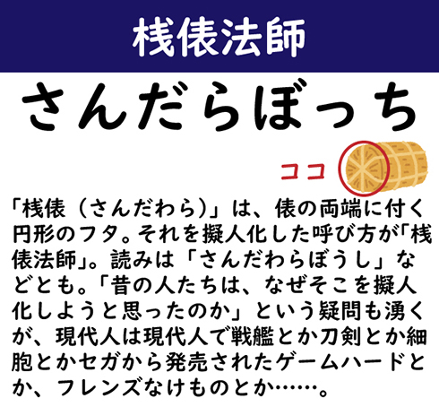 「桟俵(さんだわら)」は、俵の両端に付く円形のフタ。それを擬人化した呼び方が「桟俵法師」。読みは「さんだわらぼうし」などとも。「昔の人たちは、なぜそこを擬人化しようと思ったのか」という疑問も湧くが、現代人は現代人で戦艦とか刀剣とか細胞とかアンパンとか、セガから発売されたゲームハードとか、フレンズなけものとかいろいろ擬人化しているわけで。