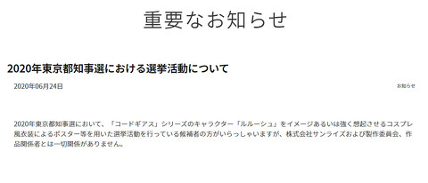 2020年東京都知事選において、アニメ「コードギアス」のキャラクター、ルルーシュを想起させるコスプレ風衣装が使用されているとして、サンライズが注意喚起を行いました。