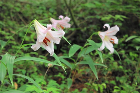 ササユリ(笹百合 Lilium japonicum)も、学名に日本と付くことからも、日本特産ユリの代表です。東日本に多いヤマユリに対応するように、本州中部以西に集中的に分布し、多くの地方亜種があります。ユリの仲間では比較的早く、6月初旬ごろから咲き始め、梅雨の季節を濡れそぼりながら咲きつぎます。花は薄桃色にほのかな斑が入り、雄しべの葯の朱色との対比が愛らしく、可憐さが際立ちます。葉は互生して細長く、ササの葉に似るために「笹百合」と呼ばれます。日本には西洋のような百合信仰や偏愛はほとんど見られませんが、奈良市の率川(いさがわ)神社に伝わる6月半ばに行われる三枝祭(さいくさのまつり)では、祭神の姫蹈鞴五十鈴姫命(ひめたたらいすずひめのみこと)に捧げる酒蚘(しゅそん)にそえる神饌に狭韋(さゐ)、つまり笹百合の花を飾り、巫女がササユリを手に持ち舞いを奉納する、特異なササユリ信仰が見られます。