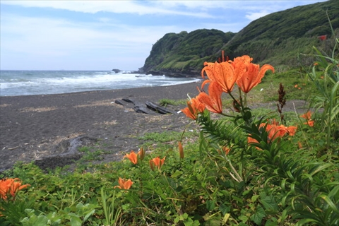 磯辺の厳しい環境で力強く咲くスカシユリ。強健さと端正な花姿です