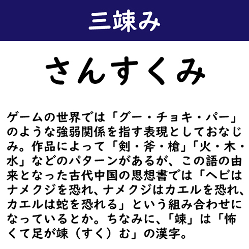 ゲームの世界では「グー・チョキ・パー」のような強弱関係を指す表現としておなじみ。作品によって「剣・斧・槍」「火・木・水」などのパターンがある。この語の由来となった古代中国の思想書では「ヘビはナメクジを恐れ、ナメクジはカエルを恐れ、カエルは蛇を恐れる」という組み合わせになっているとか。ちなみに、「竦」は「怖くて足が竦(すく)む」の漢字。