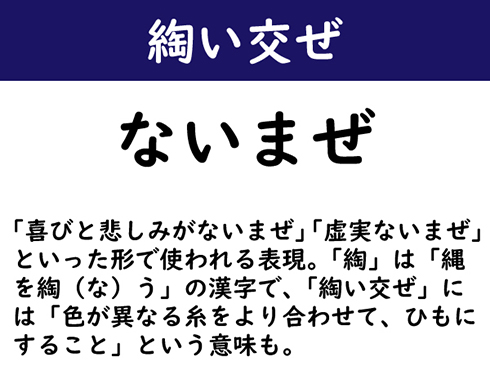 「喜びと悲しみがないまぜ」「虚実ないまぜ」といった形で使われる表現。「綯」は「縄を綯(な)う」の漢字で、「綯い交ぜ」には「色が異なる糸をより合わせて、ひもにすること」という意味も。