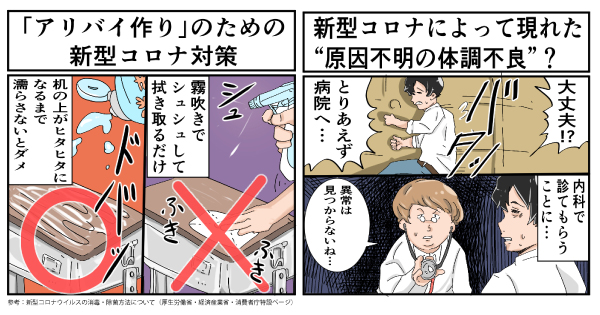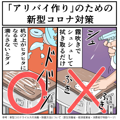 それから、“生徒たちが帰ってから教室内の机やイス、取っ手などを次亜塩素酸水で消毒する”という対策もやってるんだけど、やり方がマズい。霧吹きでシュッシュして拭き取るだけなんだよ。