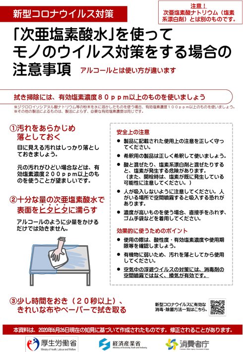 『次亜塩素酸水』を使って モノのウイルス対策をする場合の 注意事項」の一部(厚生省より)